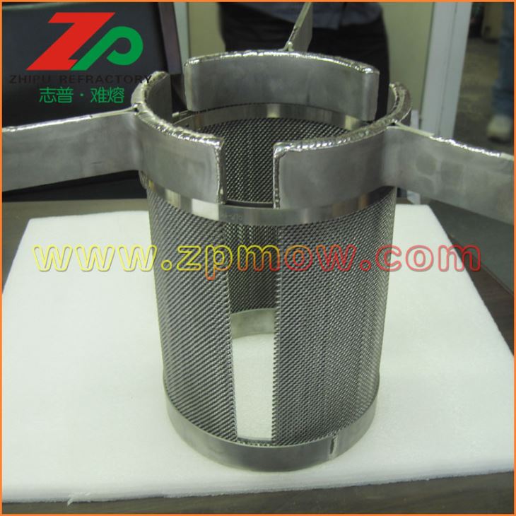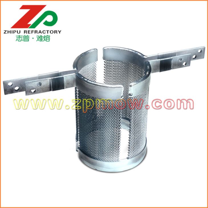 發(fā)熱體一般采用鳥籠結(jié)構(gòu)鎢發(fā)熱體或者鎢絲網(wǎng)發(fā)熱體,有利于提供均勻穩(wěn)定的溫場。 鎢絲網(wǎng)發(fā)熱體組件做為藍(lán)寶石晶體生長爐內(nèi)的熱源,對鎢坩堝內(nèi)的熔液形成湍流、產(chǎn)生徑向溫度梯度具有決定性的作用。因此,具有高純度、高密度、制作精良、設(shè)計(jì)合理的鎢絲網(wǎng)發(fā)熱體組件對藍(lán)寶石晶體的質(zhì)量控制,節(jié)約能源以及使用壽命具有重要意義。