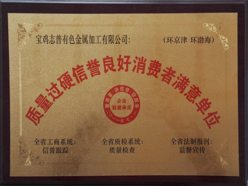 寶雞志普有色金屬加工有限公司被授予質(zhì)量過硬信譽(yù)良好消費(fèi)者滿意單位并頒發(fā)證書。
