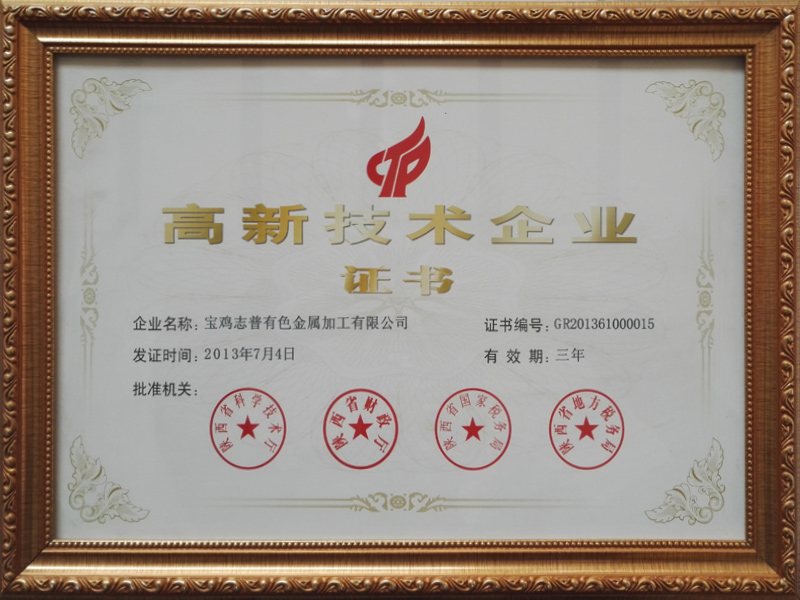 2013年7月,寶雞志普有色金屬加工有限公司被陜西省科學(xué)技術(shù)廳、陜西省財(cái)政廳、陜西省國(guó)家稅務(wù)局、陜西省地方稅務(wù)局聯(lián)合授予高新技術(shù)企業(yè)并頒發(fā)證書。