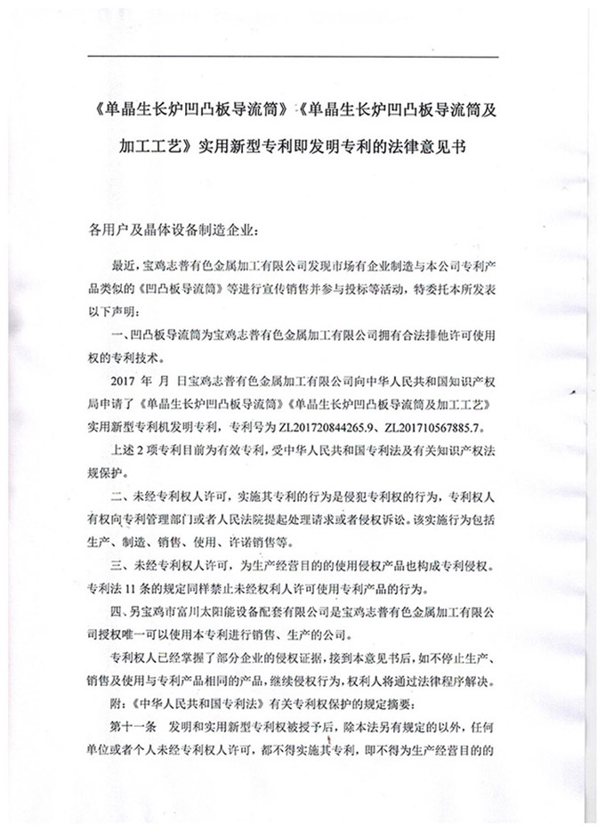 《單晶生長爐凹凸板導流筒》發(fā)明專利的法律意見書